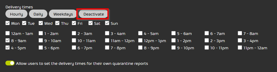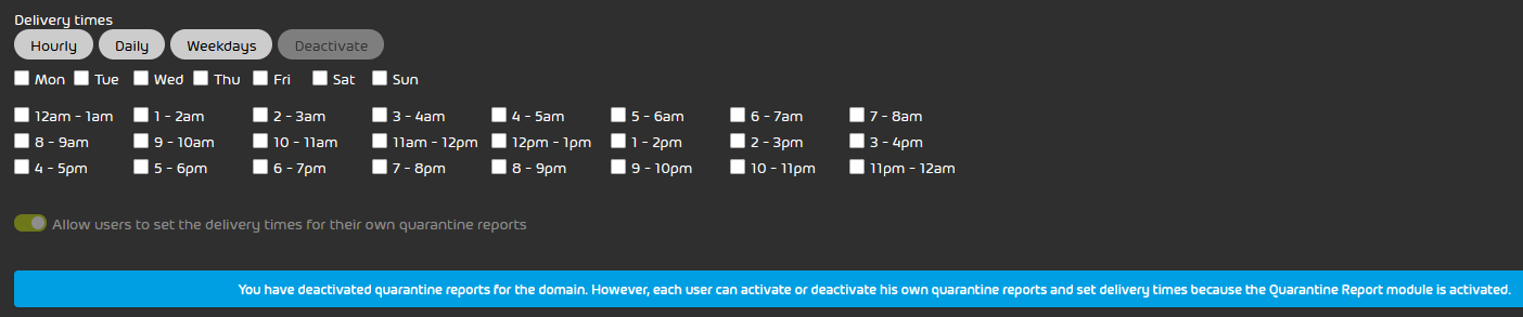 However, each user can activate or deactivate his own quarantine reports and set the delivery times as long as the entire Quarantine Report module remains activated.
