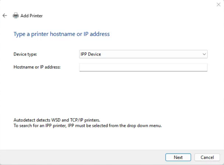 If the TCP/IP Device option is completely missing from the "Device type" dropdown and you only see "IPP Device," a system feature called Windows Protected Print Mode (WPP) is likely enabled. When active, WPP restricts printer installations to modern, secure protocols (like IPP) and disables legacy options like the Standard TCP/IP Port.