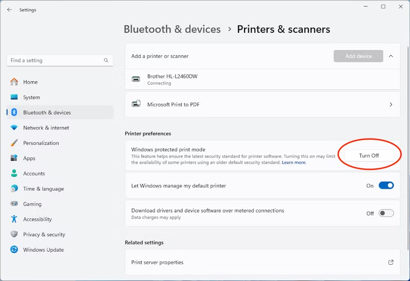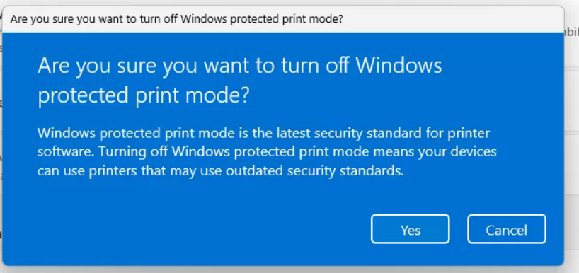 Go to Settings > Bluetooth & devices > Printers & scanners. Check for a setting titled Windows Protected Print Mode.
