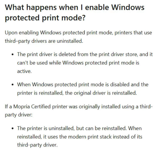 Not only this setting prevent you from installing certain printers, and the use of TCP/IP but when you manually enabled it it also uninstall printers that are not compatible with Windows 11.